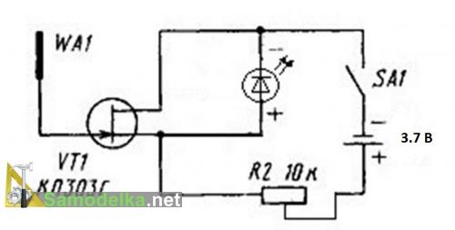 Сам девайс делал на полевом транзисторе, сильно не заморачивался, поставил «полевик» какой был, можете поэкспериментировать с транзисторами КП303 и их аналогами. В качестве источника питания использовал старый аккумулятор от мобилки (питание можно использовать от 3 до 9 в.), подстроечник ставил на 10кОм. (при питании 3.7в.) Если питать от кроны, то резистор на 30кОм. P.s. Подстроечным резистором регулируете чувствительность прибора, я сделал в корпусе отверстие под маленькую отвертку, что бы всегда можно было подстроить прибор не разбирая его. В качестве «антенны» (искателя) использовал медный провод в изоляции длинна 10см.