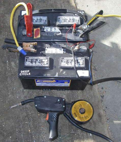 Дальше подключаем — батереи толстым проводом на корпус нашей свариваемой детали и на пистолет для работы привода проволоки, а + к сварочному полуавтоматическому пистолету.