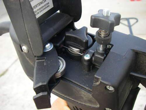 В рукоятке установлен двигатель для подачи проволоки, особенности ( чем выше напряжение батареи тем быстрее вращается двигатель, дополнительной регулировки вращения в этом чудо сварочном полуавтомате нет, но можно самому сделать простенький регулятор либо регулировать напряжение включением дополнительных сопротивлений. Также можно использовать внешние регулируемые источники питания. Главное при сварке полуавтоматом необходимо подобрать оптимальную подачу сварочной проволоки. Используйте справочники для сварщиков, там много полезного, или можно воспользоваться методом научного тыка как обычно. Измерить скорость подачи очень просто – включите двигатель подачи ровно на одну секунду и измерьте сколько метров вылезло проволоки.