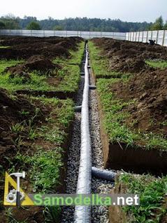 Самым распространенным способом для укладки дренажных труб является способ ёлочкой, где главная труба имеет диаметр 10 см. а вспомогательные трубы 7.5см.